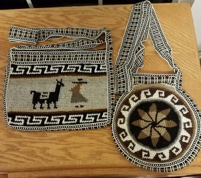 This purse is eye catching and just the right size. Shoulder strap is long and can be worn across your chest. Rectangular is 12” x 9” and round purse is 12” across.